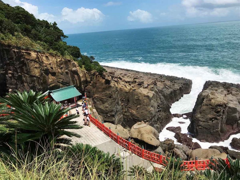 普通は本殿まで登って行くのですが、ここは本殿が下りたとこにある「下り宮(くだりみや)」と呼ばれ、「日本三大下り宮」の中に数えられます。海辺の大きな崖の洞窟の中にあり、神社から見る海は、一度見たら忘れられないくらいの絶景です。洞窟も自然の力でできたもので、県外から多くの観光客が来るのもわかる気がします。